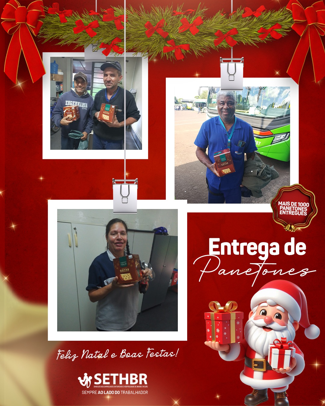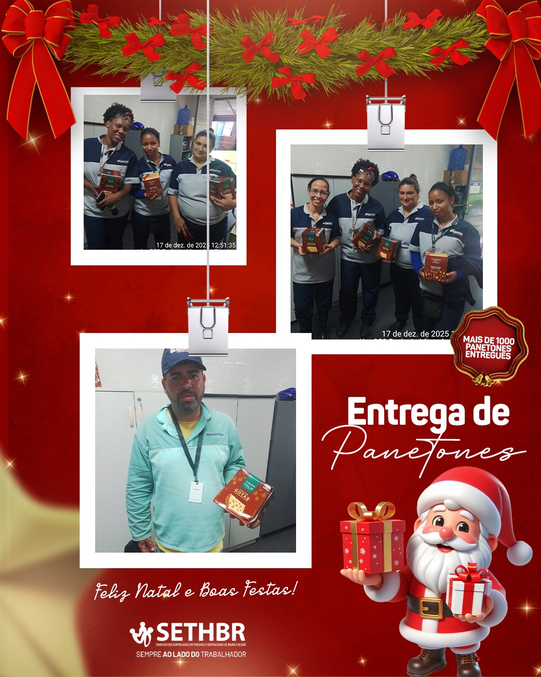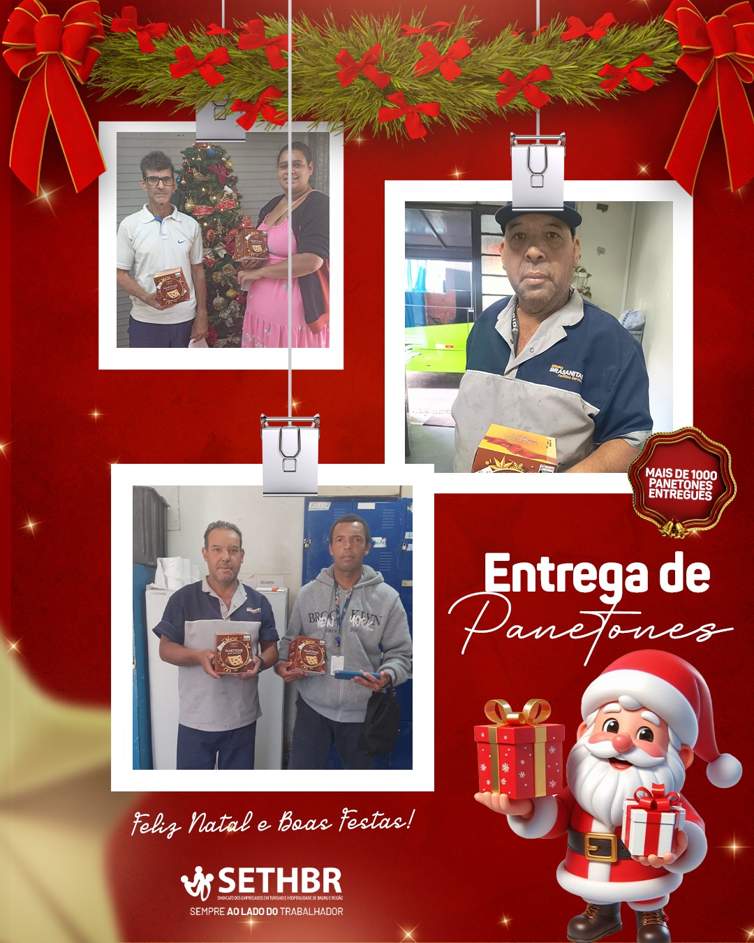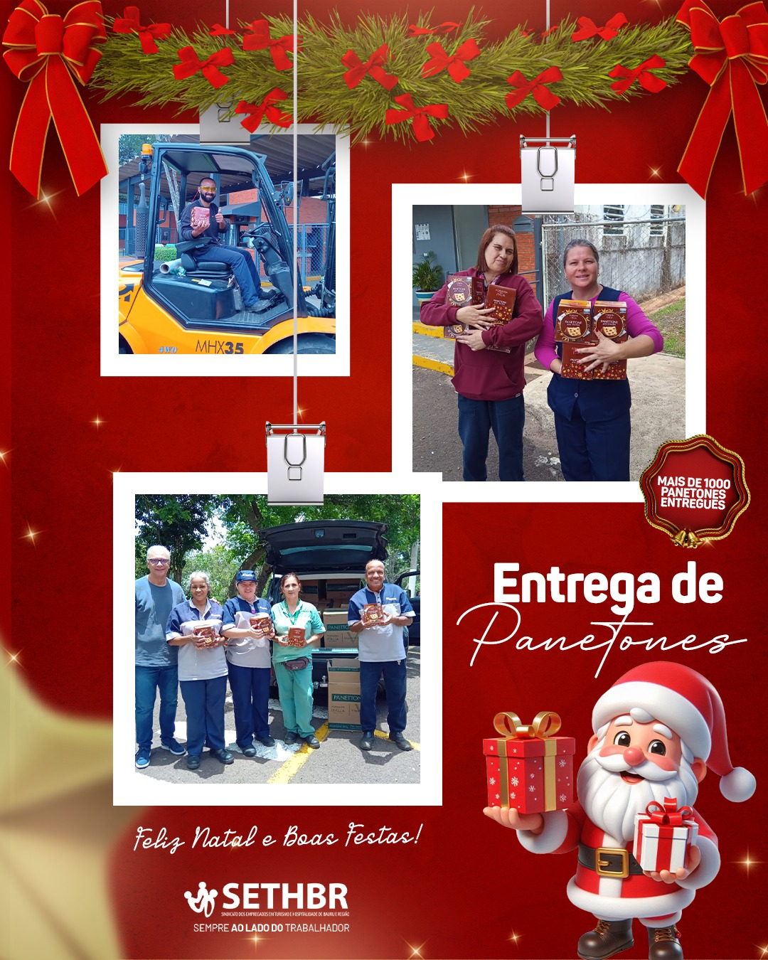 Neste ano, tivemos a alegria de entregar mais de 1.500 panetones aos nossos associados, levando um pouco do sabor e do carinho do SETHBR para a mesa de cada trabalhador. Ver o sorriso de vocês é o que nos motiva a continuar nossa missão.