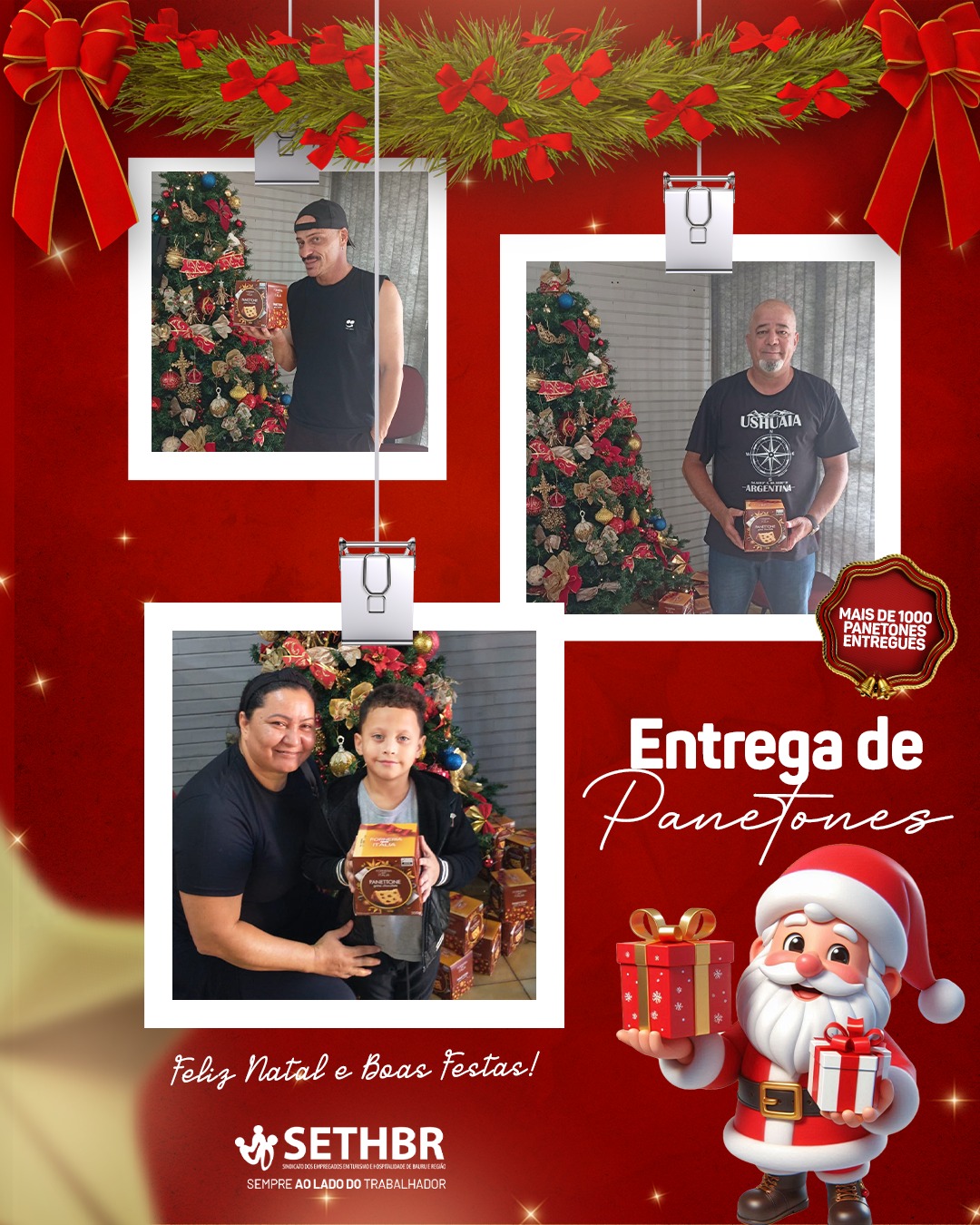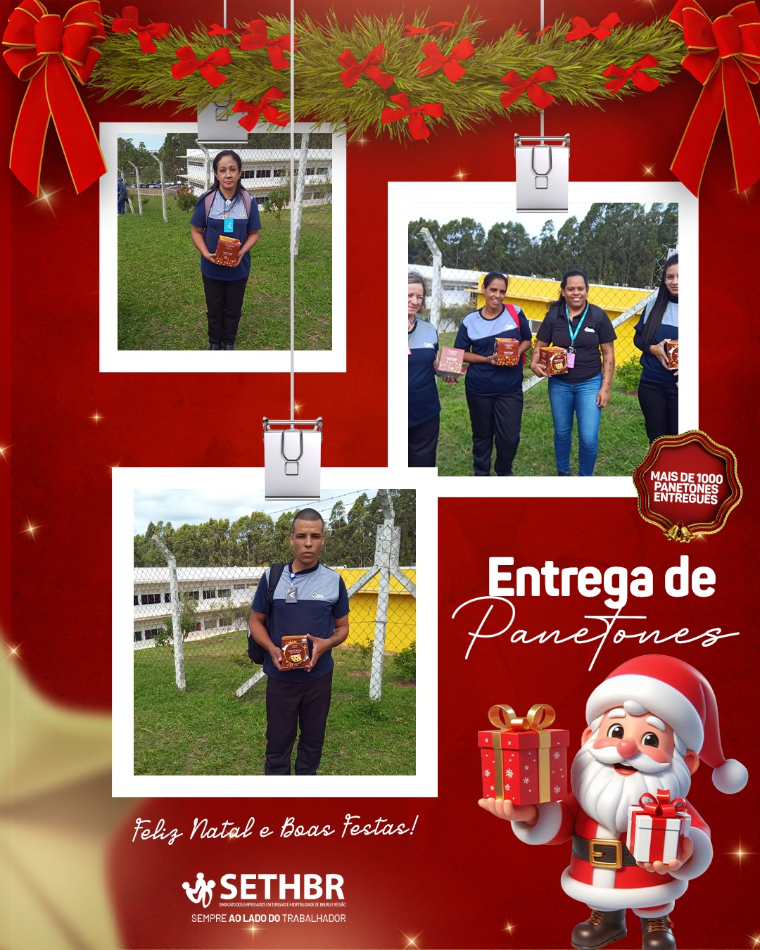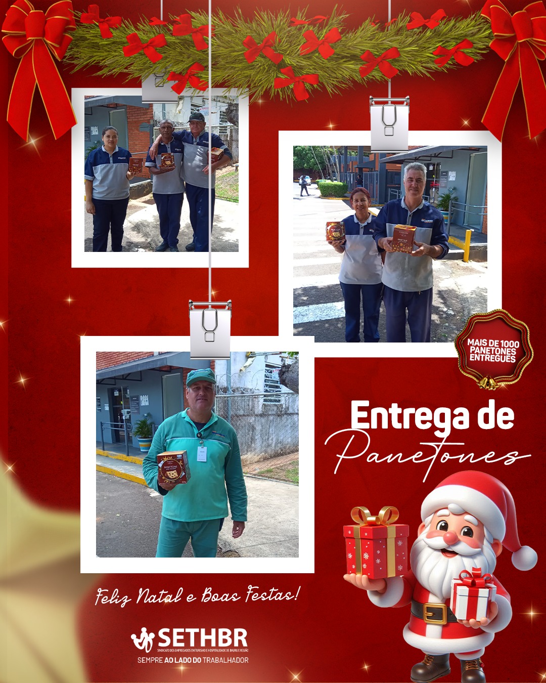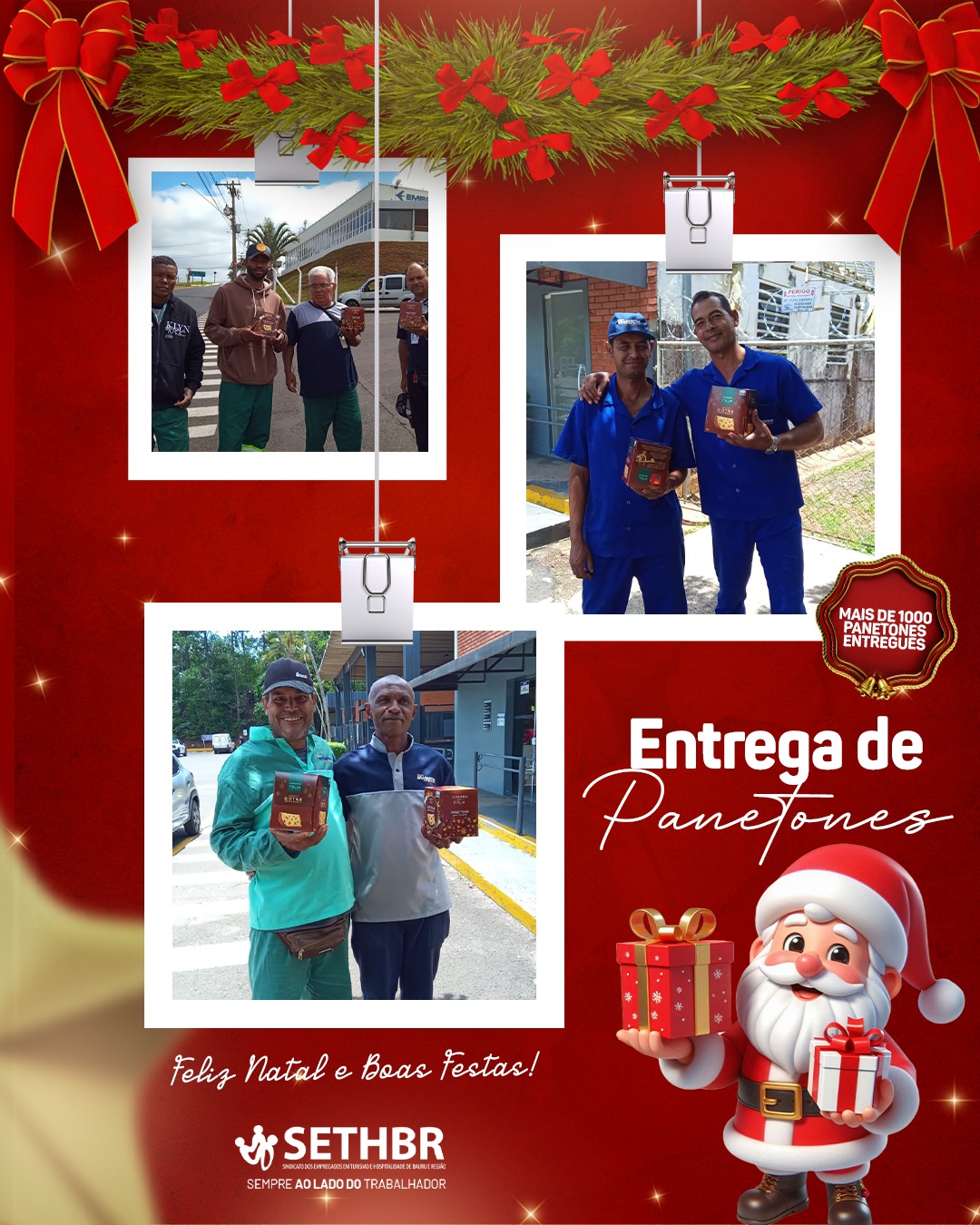 Neste ano, tivemos a alegria de entregar mais de 1.500 panetones aos nossos associados, levando um pouco do sabor e do carinho do SETHBR para a mesa de cada trabalhador. Ver o sorriso de vocês é o que nos motiva a continuar nossa missão.