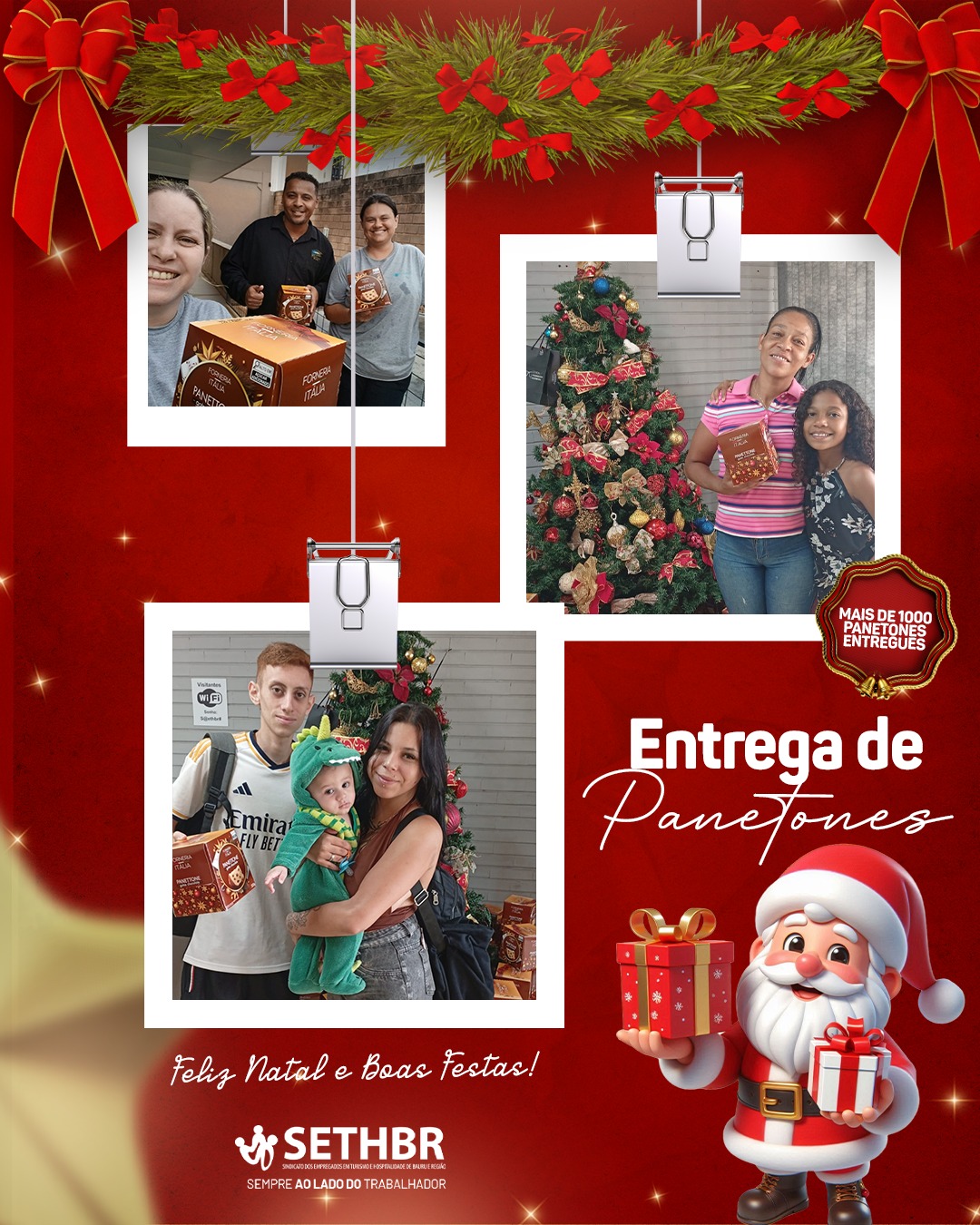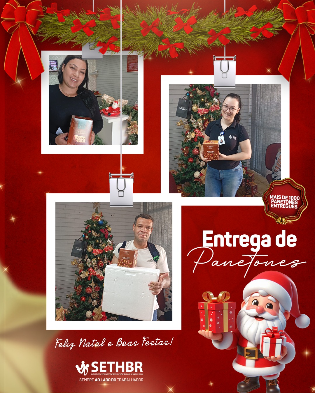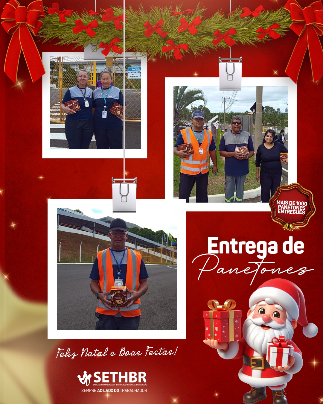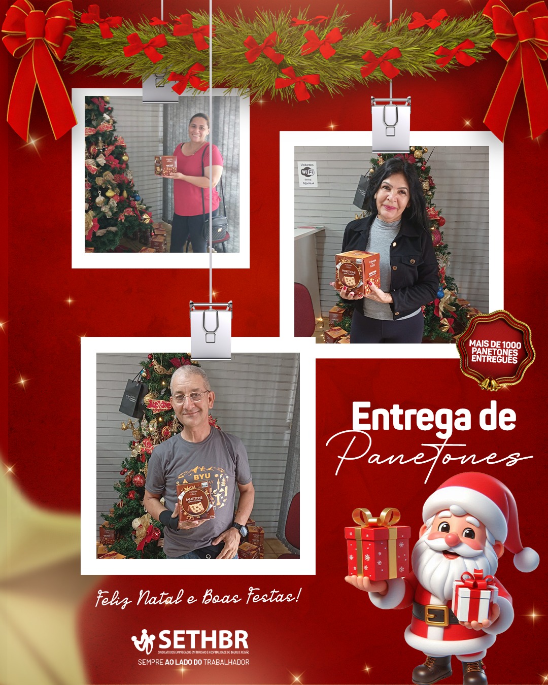 Neste ano, tivemos a alegria de entregar mais de 1.500 panetones aos nossos associados, levando um pouco do sabor e do carinho do SETHBR para a mesa de cada trabalhador. Ver o sorriso de vocês é o que nos motiva a continuar nossa missão.