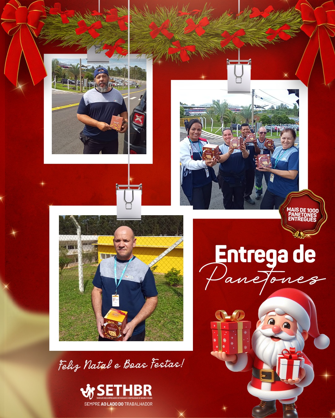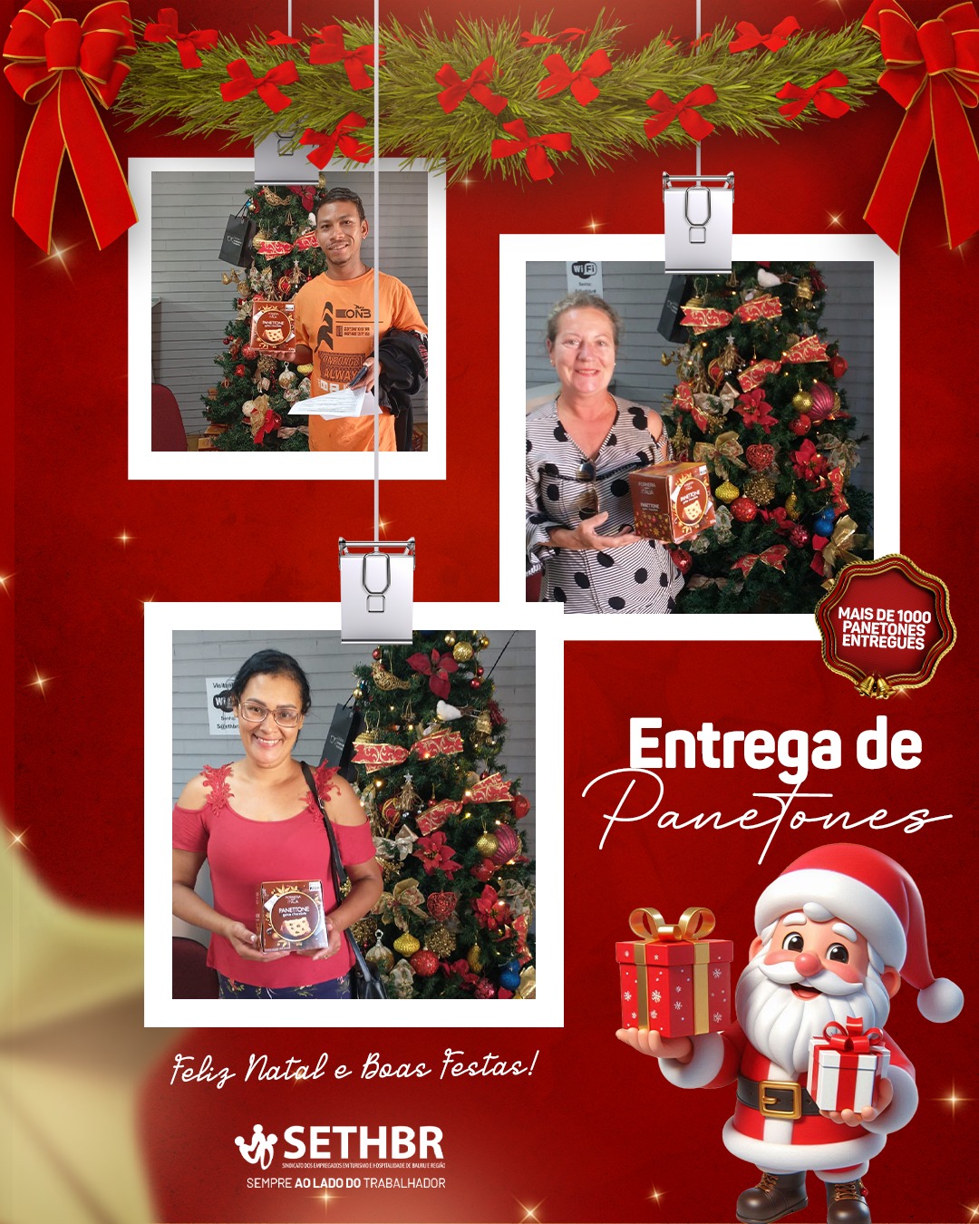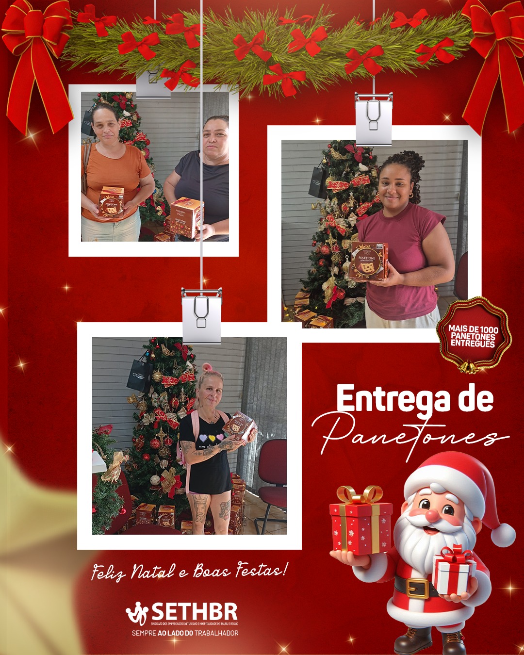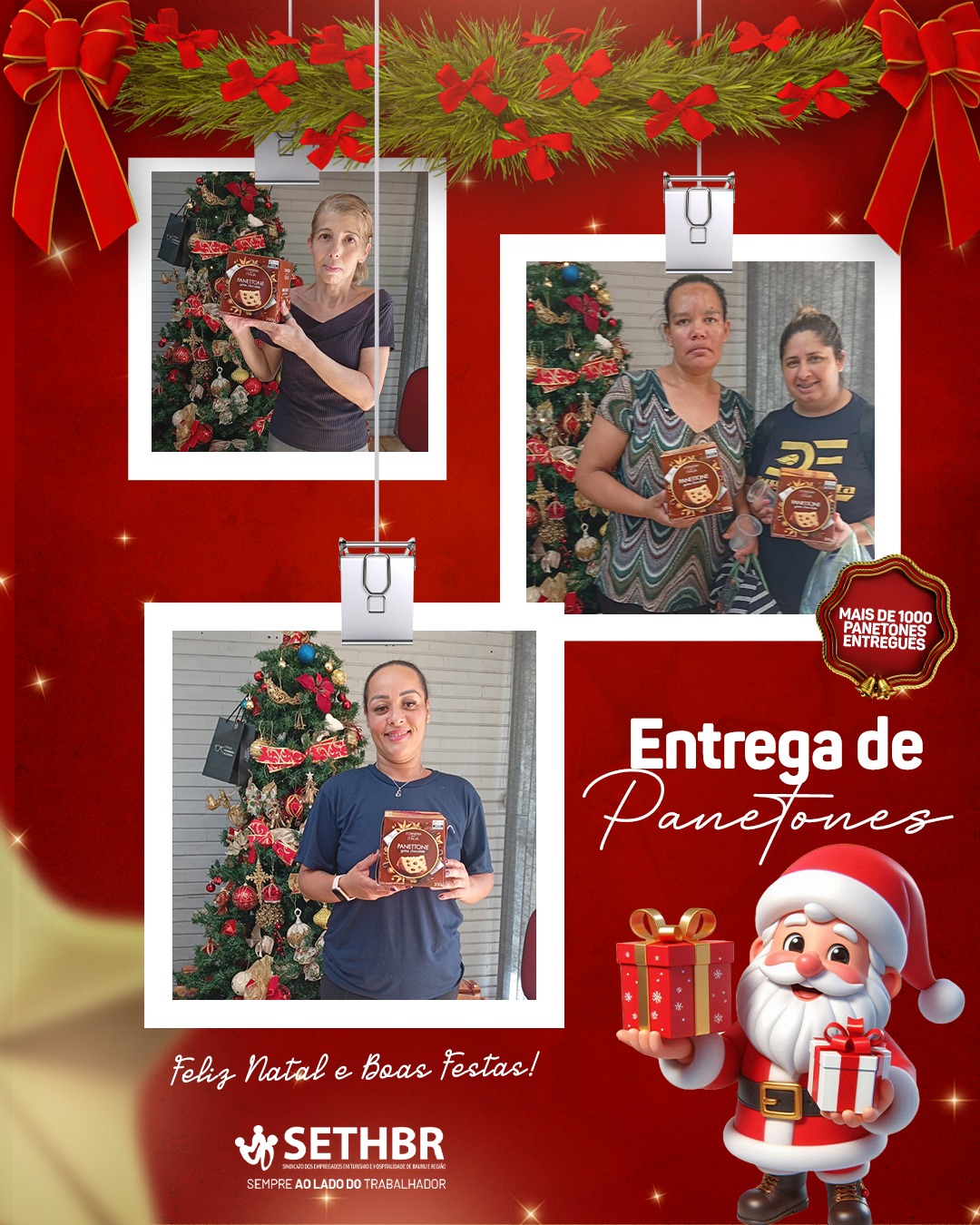 Neste ano, tivemos a alegria de entregar mais de 1.500 panetones aos nossos associados, levando um pouco do sabor e do carinho do SETHBR para a mesa de cada trabalhador. Ver o sorriso de vocês é o que nos motiva a continuar nossa missão.